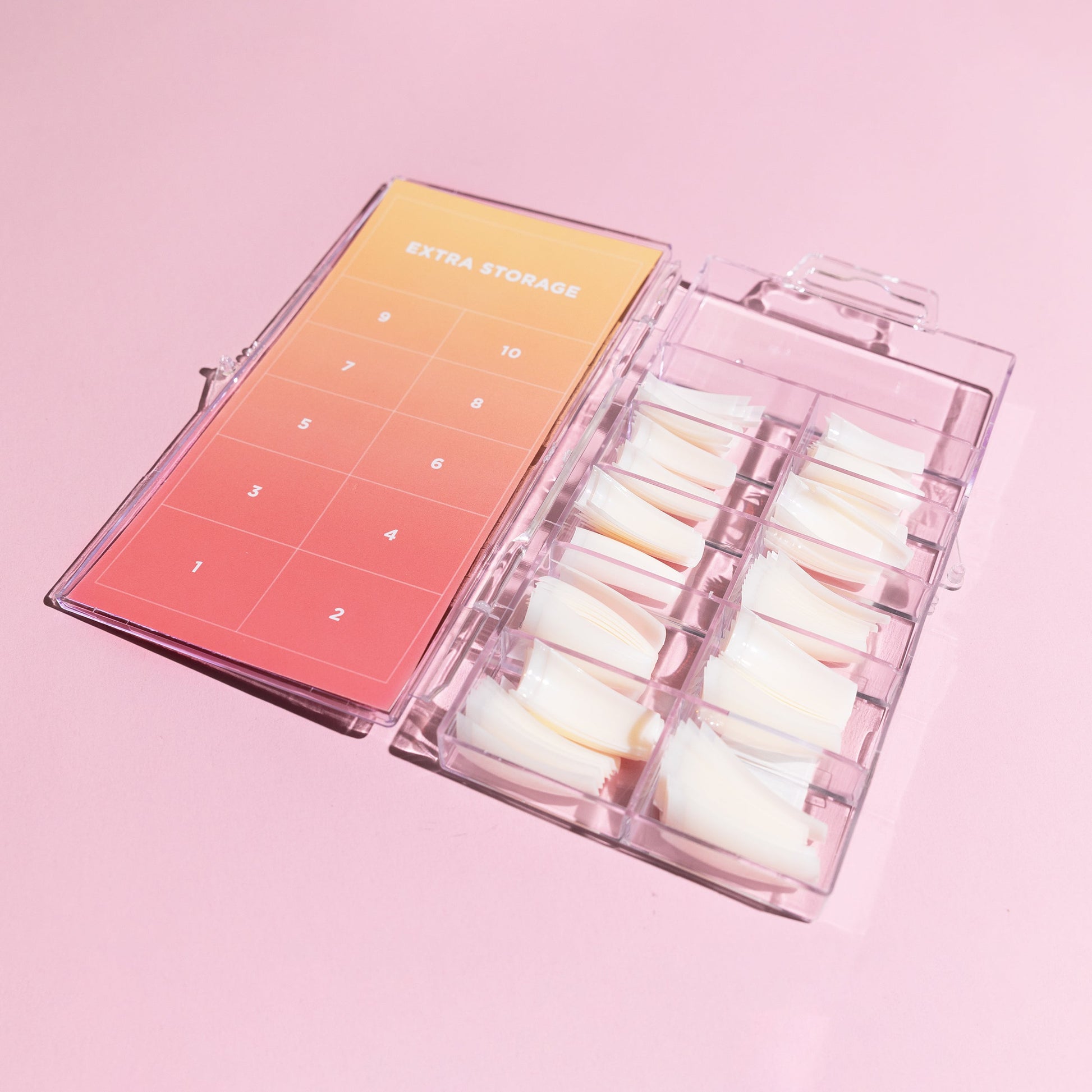 De set bevat tien tips van 10 verschillende maten - d.w.z. 100 tips in totaal. Met deze set heb je dus alle maten die je nodig hebt bij het maken van tip extensions. In de doos zijn cijfers geplaatst, waardoor je eenvoudig een overzicht krijgt van de maten en locaties van de tips.